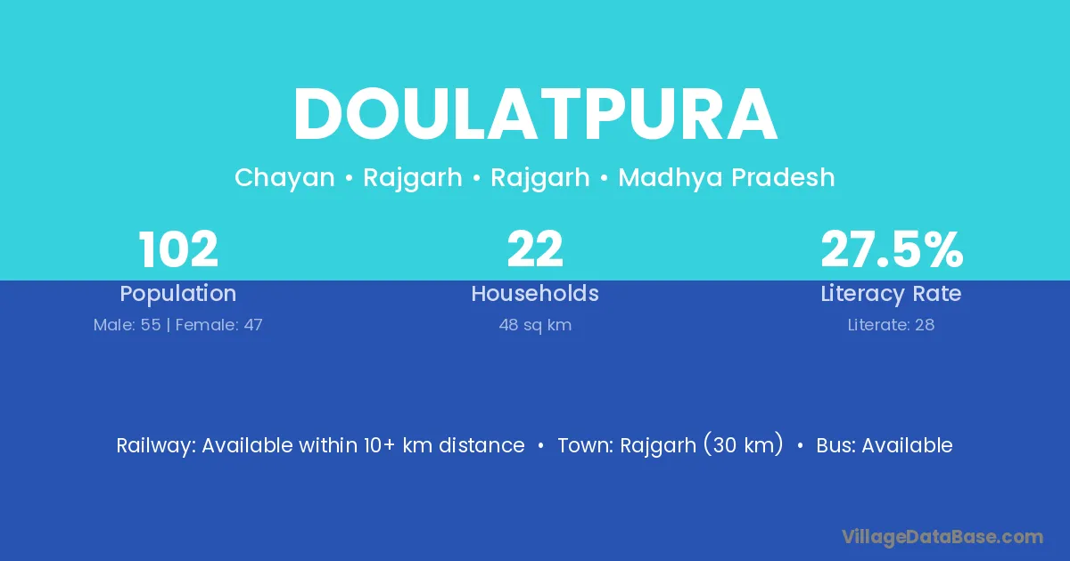 Rajgarh (30 km) is the nearest town to Doulatpura village for major economic activities and is located approximately 30 km away.