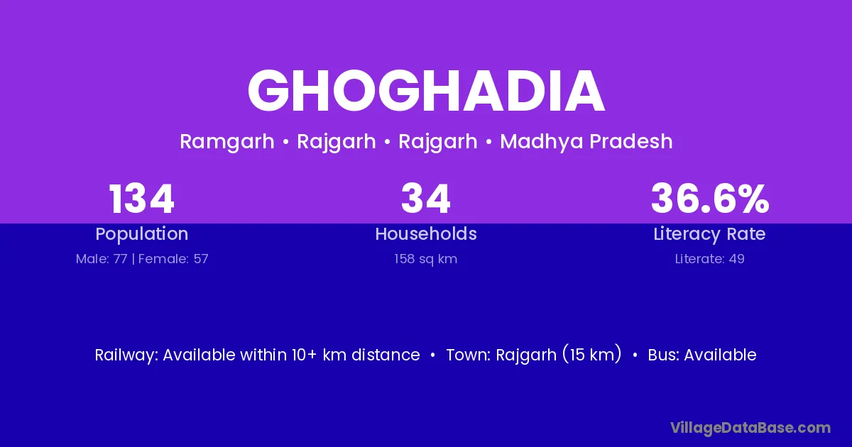 Rajgarh (15 km) is the nearest town to Ghoghadia village for major economic activities and is located approximately 15 km away.