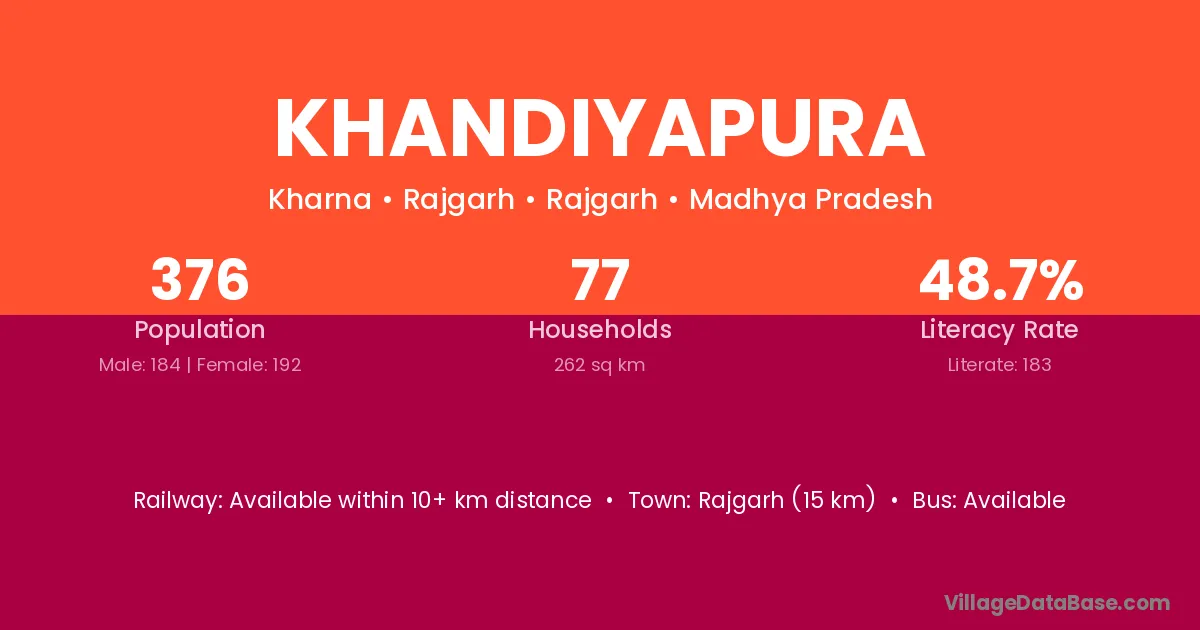 Rajgarh (15 km) is the nearest town to Khandiyapura village for major economic activities and is located approximately 15 km away.