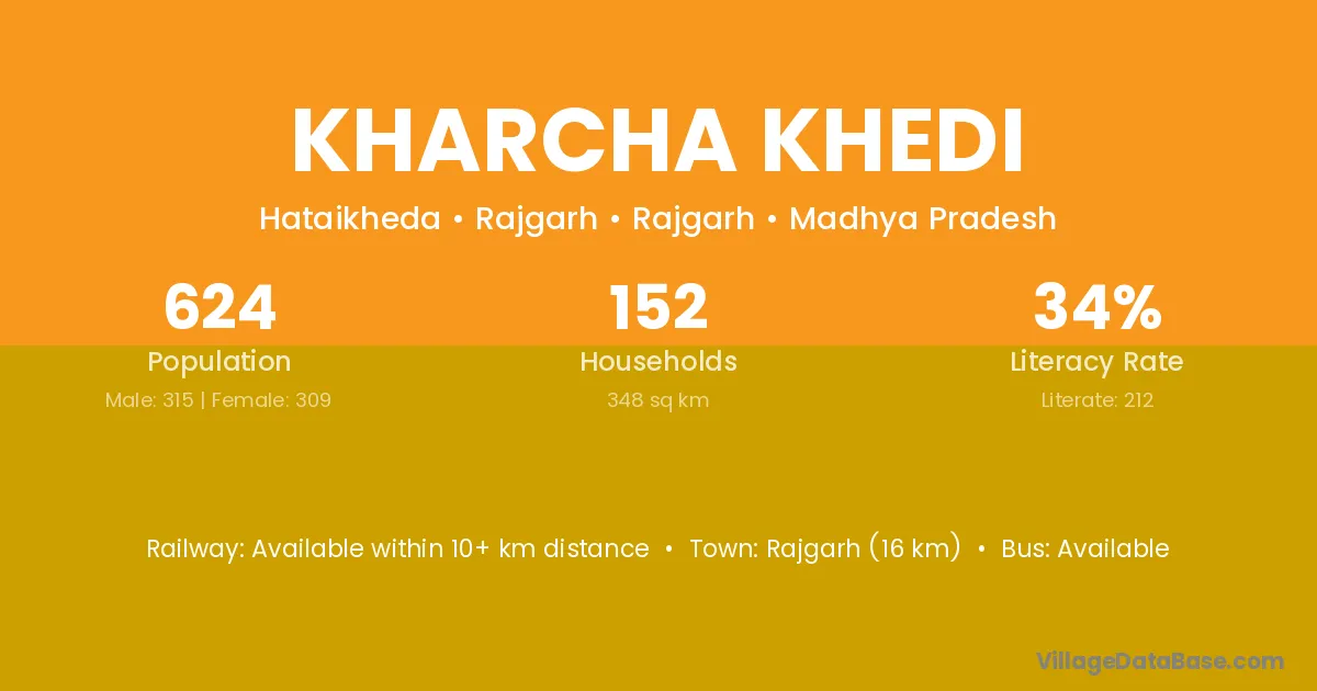 Kharcha Khedi village has a total population of 624 people, of which 315 are males and 309 are females.
