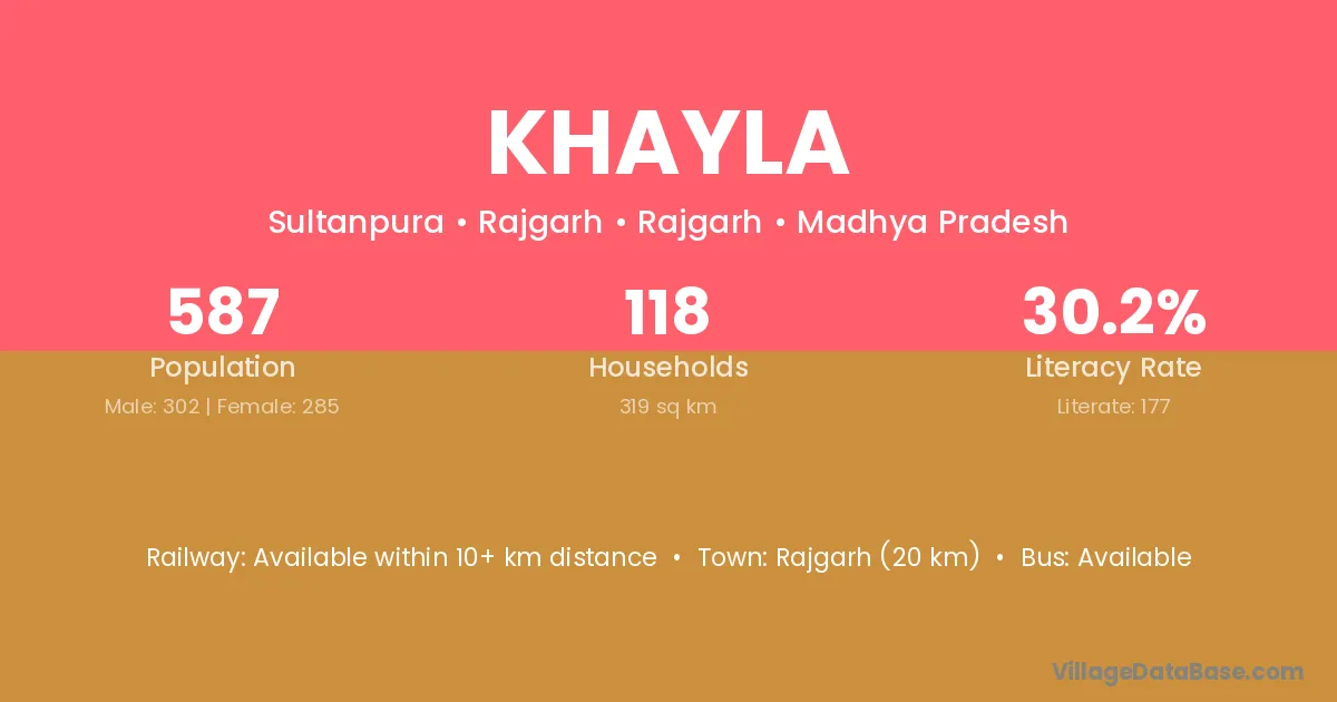 Rajgarh (20 km) is the nearest town to Khayla village for major economic activities and is located approximately 20 km away.