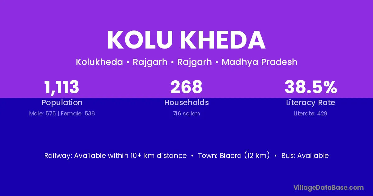 Biaora (12 km) is the nearest town to Kolu Kheda village for major economic activities and is located approximately 12 km away.