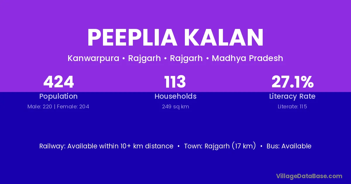Rajgarh (17 km) is the nearest town to Peeplia Kalan village for major economic activities and is located approximately 17 km away.
