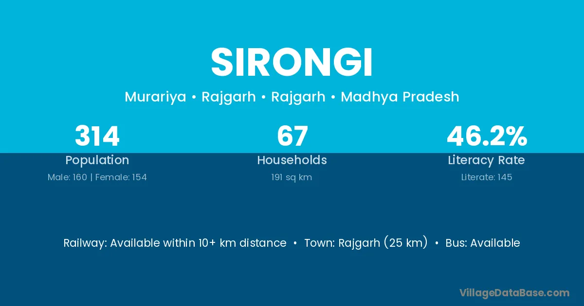 Sirongi village has a total population of 314 people, of which 160 are males and 154 are females.