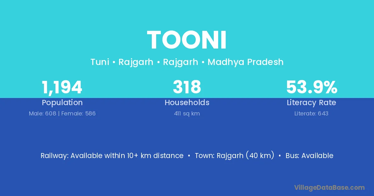 Rajgarh (40 km) is the nearest town to Tooni village for major economic activities and is located approximately 40 km away.