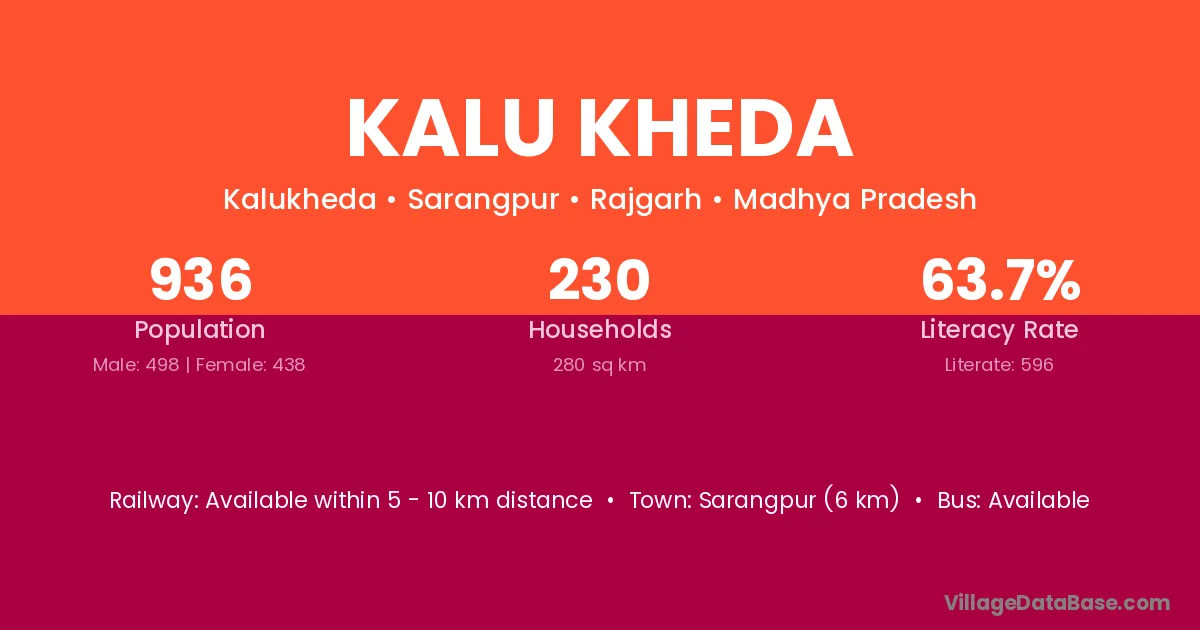 Sarangpur (6 km) is the nearest town to Kalu Kheda village for major economic activities and is located approximately 6 km away.