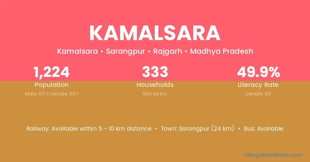 Sarangpur (24 km) is the nearest town to Kamalsara village for major economic activities and is located approximately 24 km away.