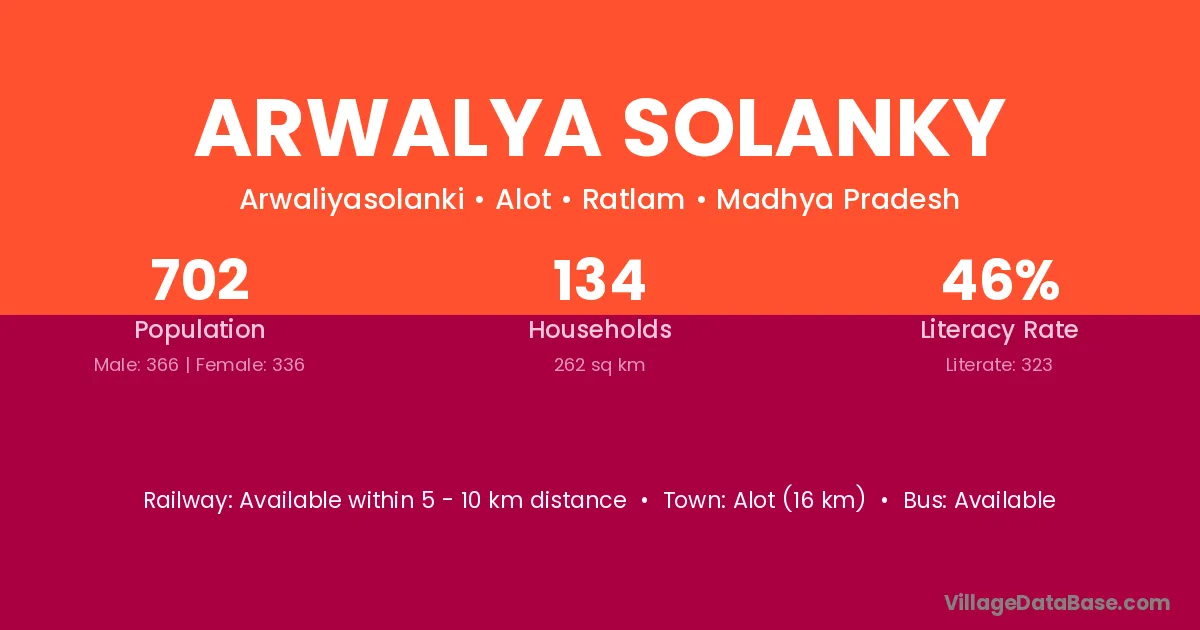 Alot (16 km) is the nearest town to Arwalya Solanky village for major economic activities and is located approximately 16 km away.