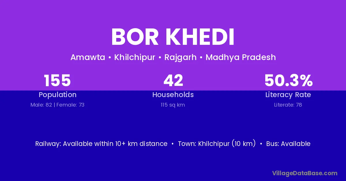 The literacy rate of Bor Khedi village is 34.78%. Male literacy stands at 50.88% and female literacy at 18.97%.