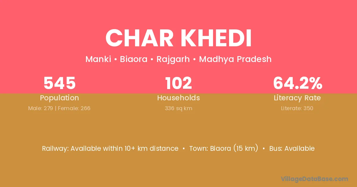 Char Khedi village has a total population of 105 people, of which 53 are males and 52 are females.