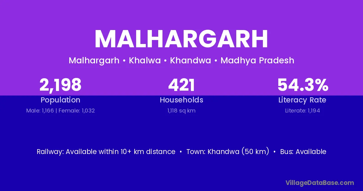 The literacy rate of Malhargarh village is 44.82%. Male literacy stands at 61.32% and female literacy at 27.39%.