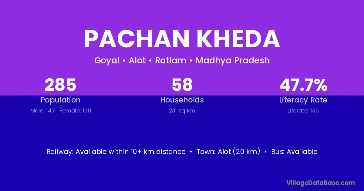 Pachan Kheda village has a total population of 285 people, of which 147 are males and 138 are females.