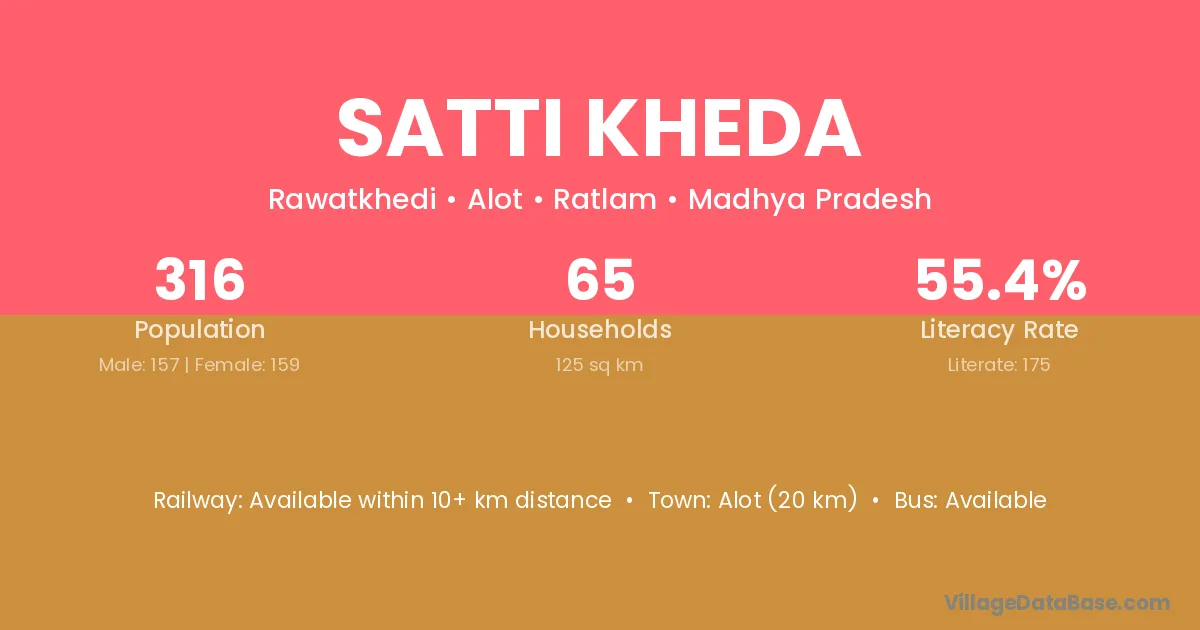 Alot (20 km) is the nearest town to Satti Kheda village for major economic activities and is located approximately 20 km away.