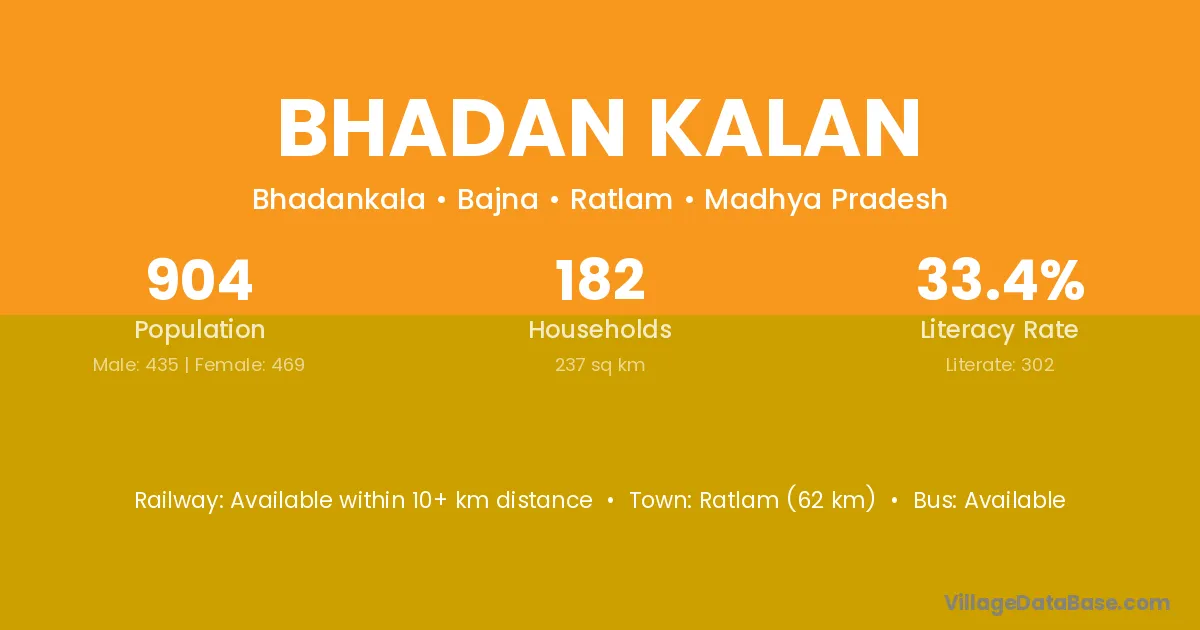 Ratlam (62 km) is the nearest town to Bhadan Kalan village for major economic activities and is located approximately 62 km away.