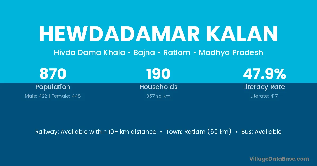 Ratlam (55 km) is the nearest town to Hewdadamar Kalan village for major economic activities and is located approximately 55 km away.