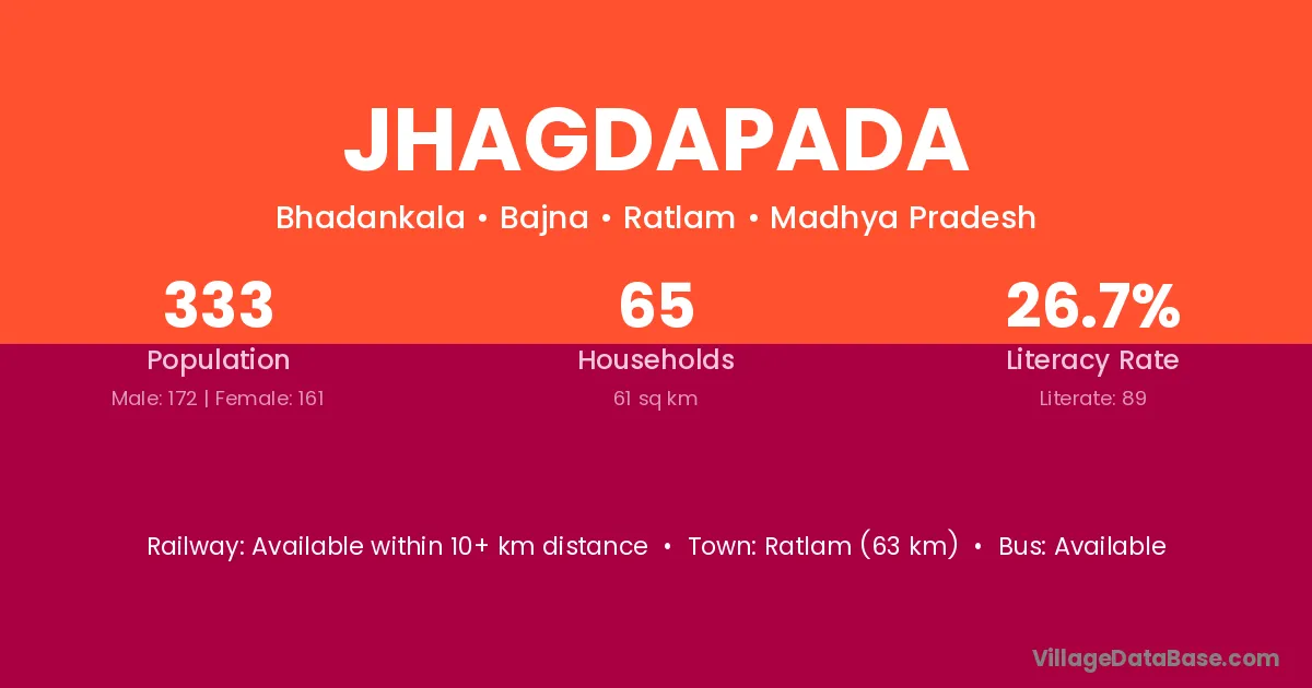 Ratlam (63 km) is the nearest town to Jhagdapada village for major economic activities and is located approximately 63 km away.
