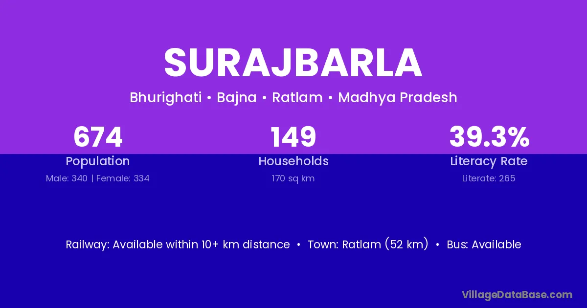 Ratlam (52 km) is the nearest town to Surajbarla village for major economic activities and is located approximately 52 km away.