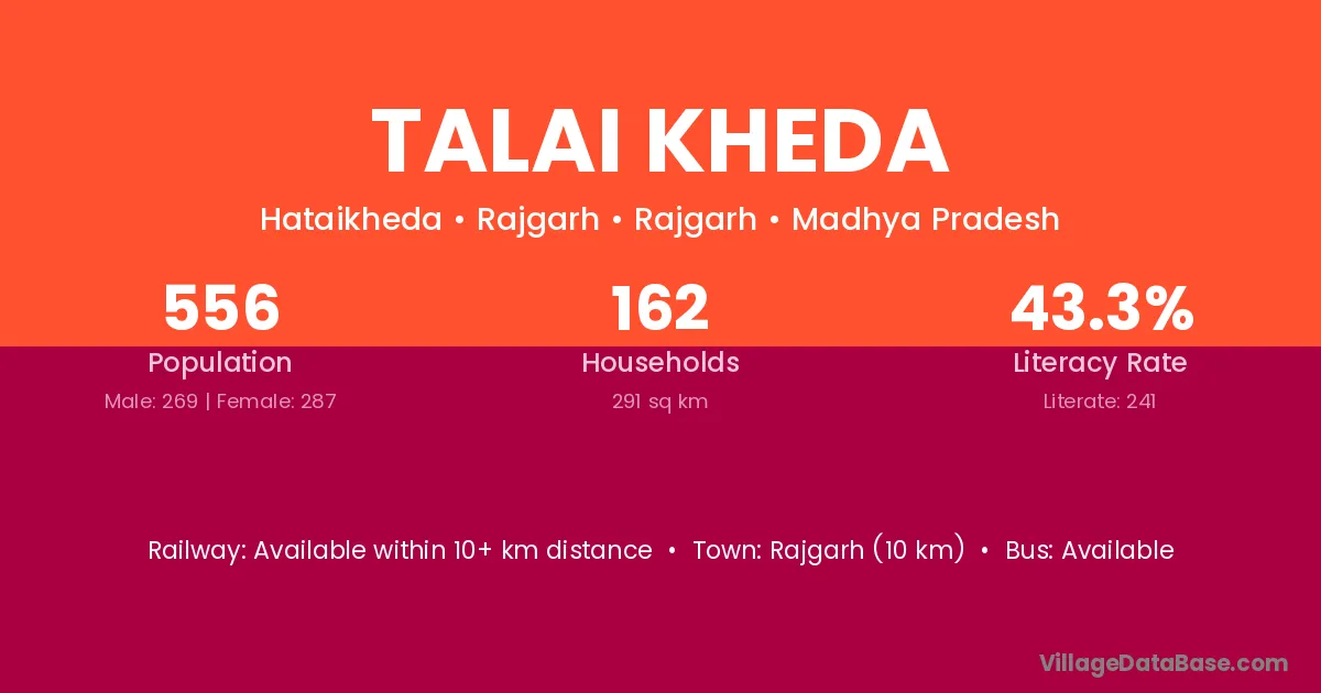 Ratlam (55 km) is the nearest town to Talai Kheda village for major economic activities and is located approximately 55 km away.
