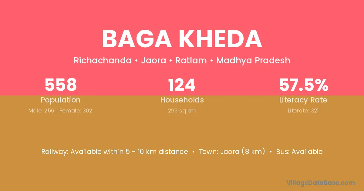 Jaora (8 km) is the nearest town to Baga Kheda village for major economic activities and is located approximately 8 km away.