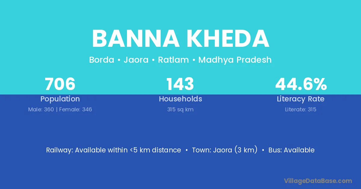 Jaora (3 km) is the nearest town to Banna Kheda village for major economic activities and is located approximately 3 km away.