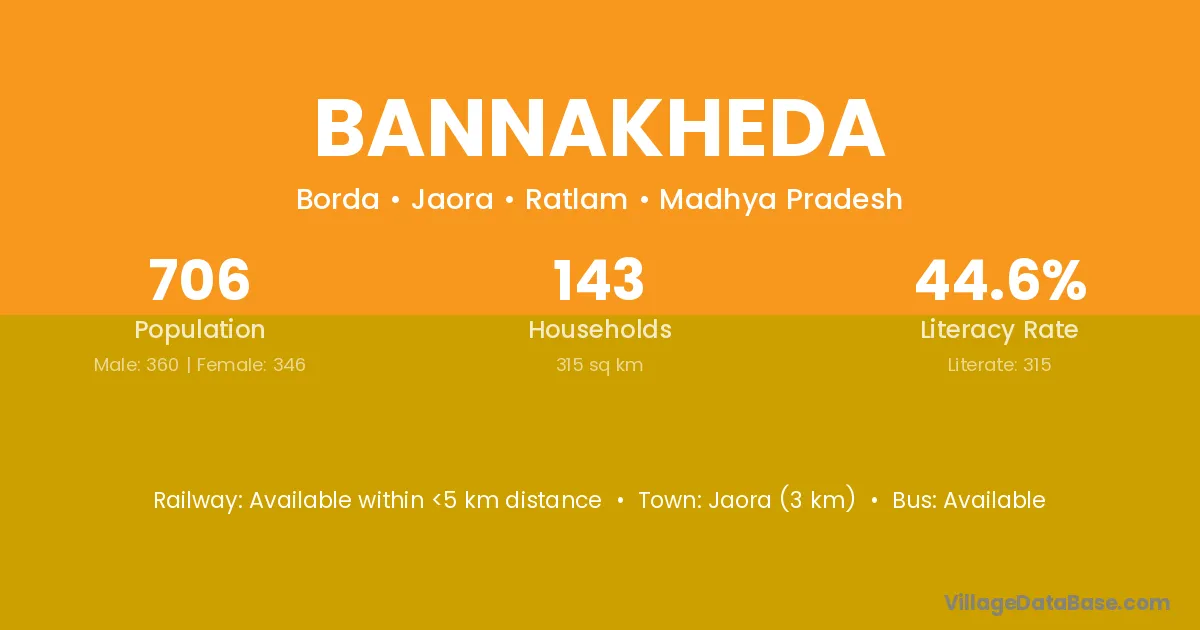 Jaora (3 km) is the nearest town to Bannakheda village for major economic activities and is located approximately 3 km away.