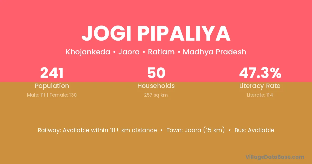 Jogi Pipaliya village has a total population of 241 people, of which 111 are males and 130 are females.
