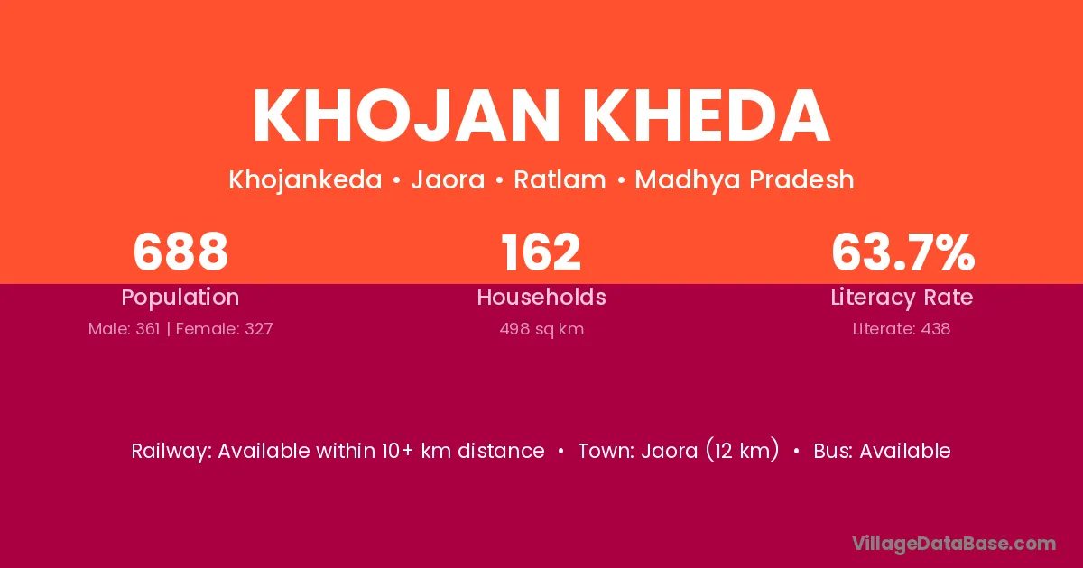 Jaora (12 km) is the nearest town to Khojan Kheda village for major economic activities and is located approximately 12 km away.