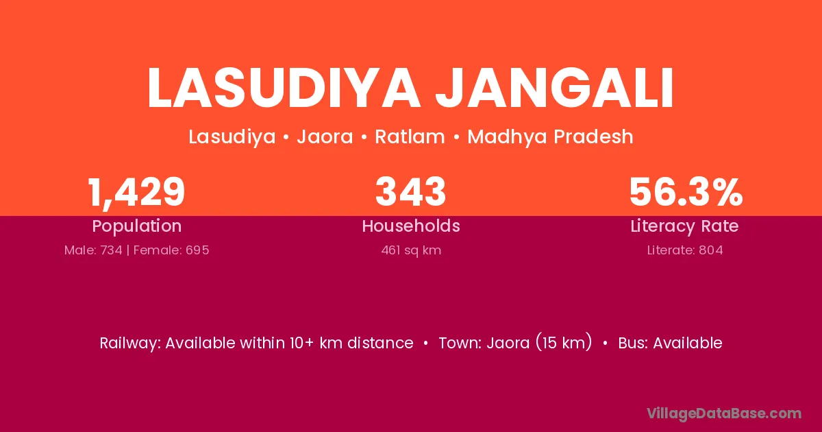 Jaora (15 km) is the nearest town to Lasudiya Jangali village for major economic activities and is located approximately 15 km away.