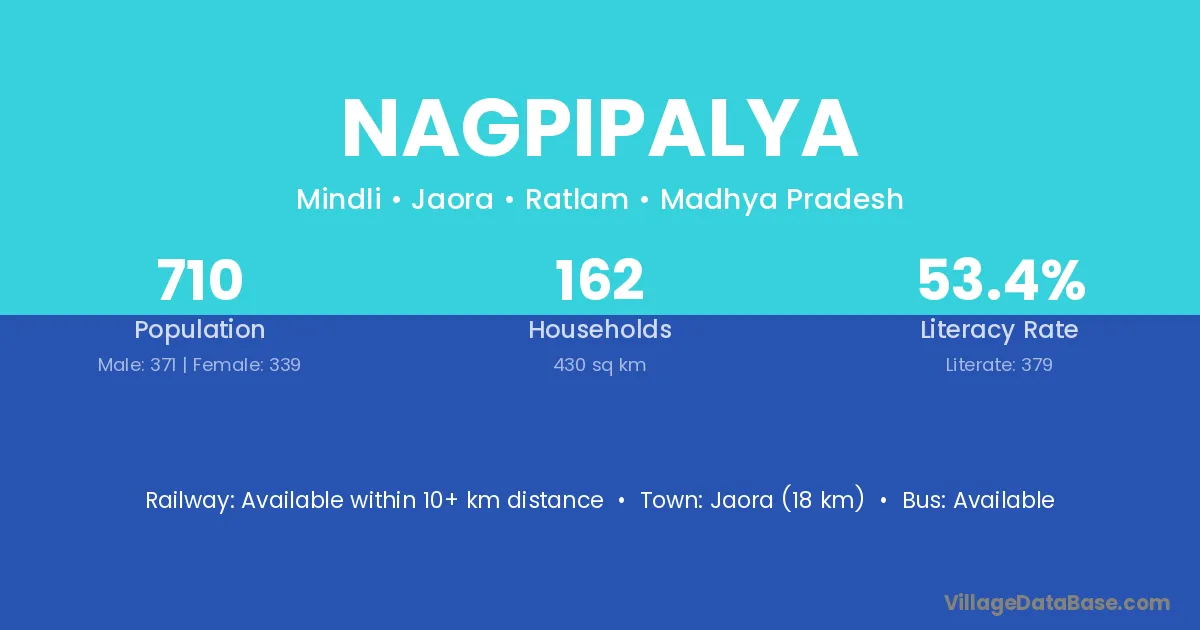 Jaora (18 km) is the nearest town to Nagpipalya village for major economic activities and is located approximately 18 km away.