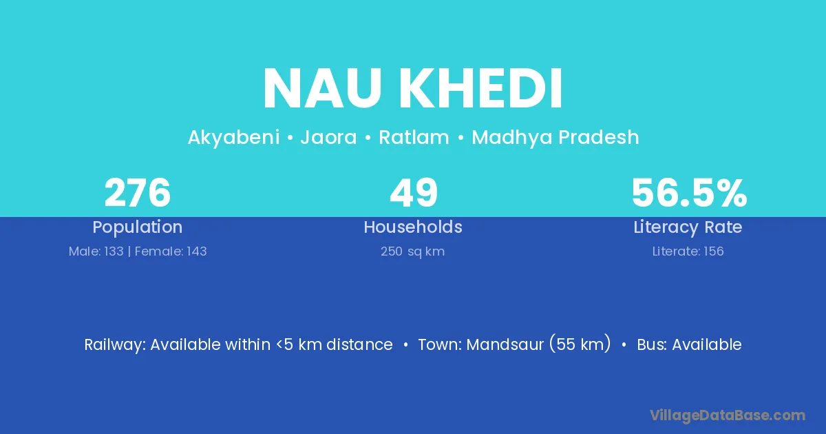 Mandsaur (55 km) is the nearest town to Nau Khedi village for major economic activities and is located approximately 55 km away.