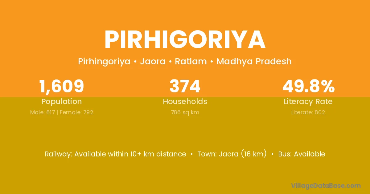 Jaora (16 km) is the nearest town to Pirhigoriya village for major economic activities and is located approximately 16 km away.