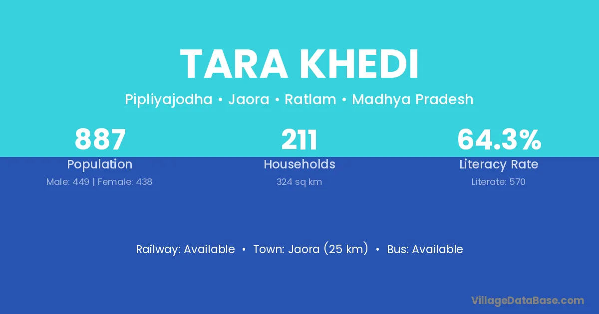 Jaora (25 km) is the nearest town to Tara Khedi village for major economic activities and is located approximately 25 km away.