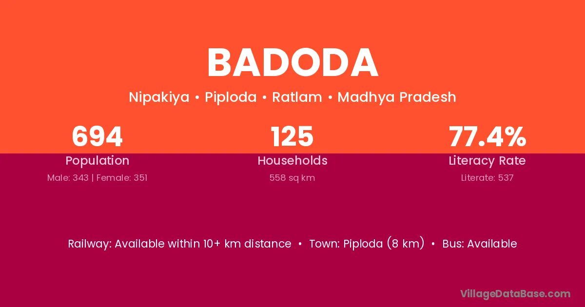 Piploda (8 km) is the nearest town to Badoda village for major economic activities and is located approximately 8 km away.