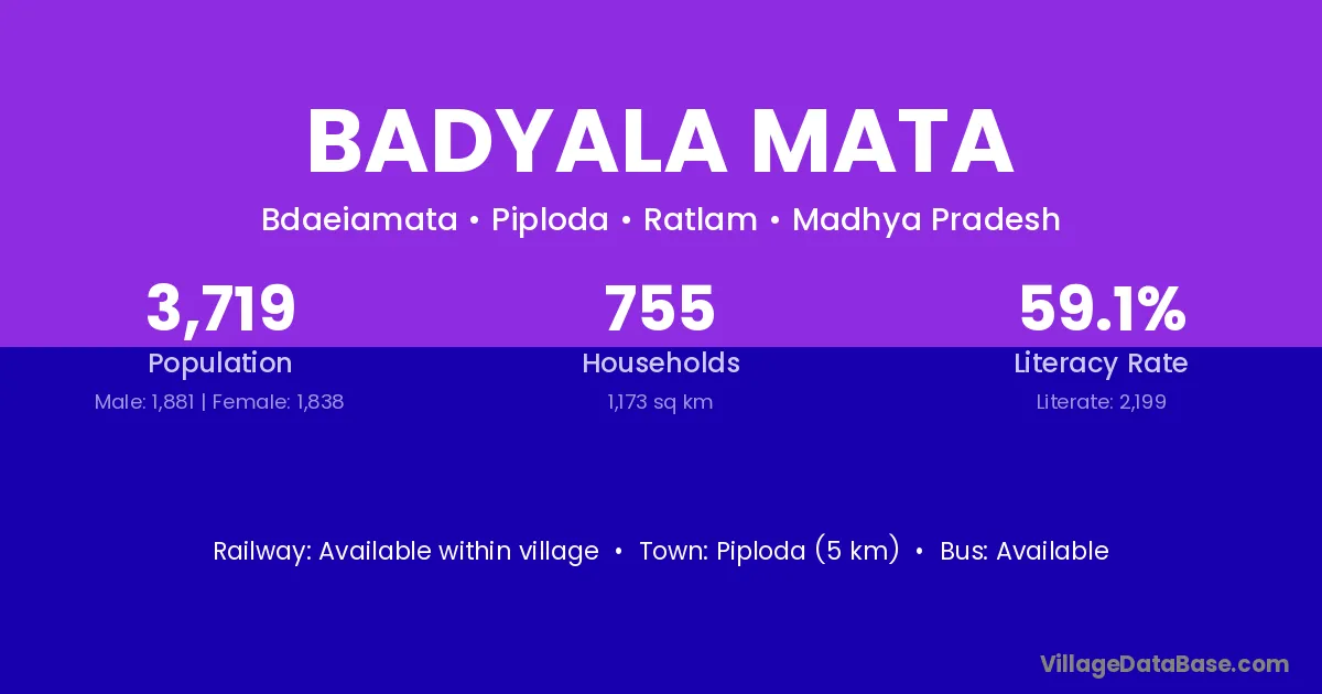 Piploda (5 km) is the nearest town to Badyala Mata village for major economic activities and is located approximately 5 km away.