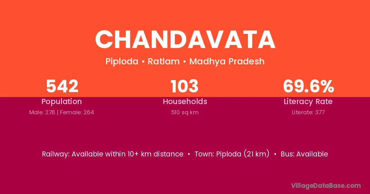 Piploda (21 km) is the nearest town to Chandavata village for major economic activities and is located approximately 21 km away.