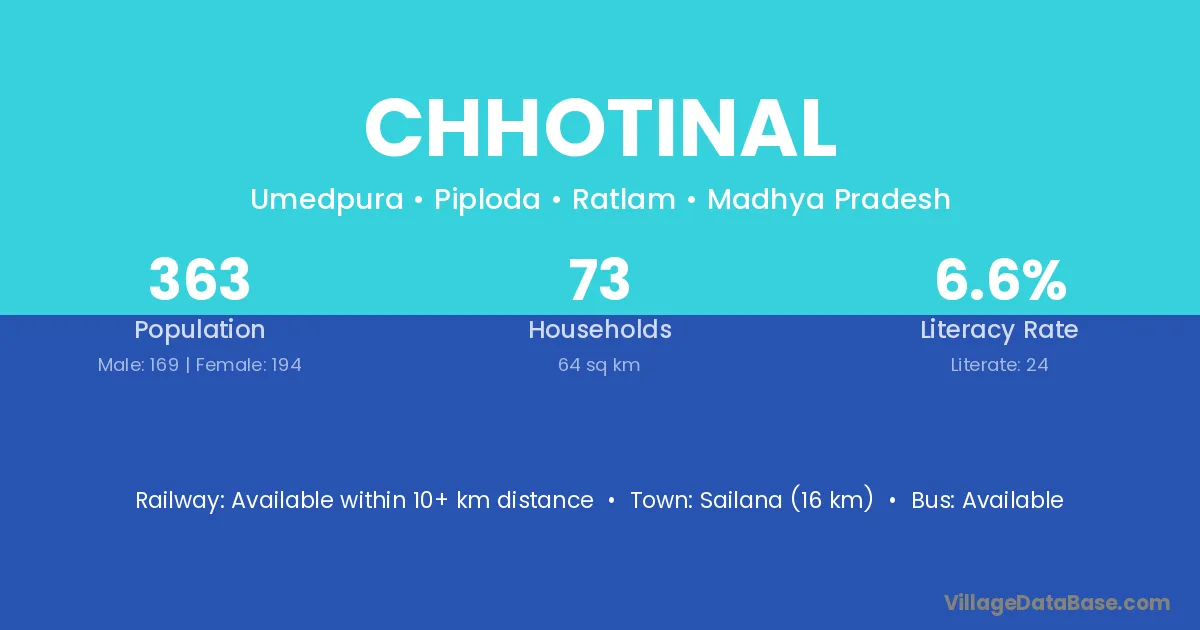 Sailana (16 km) is the nearest town to Chhotinal village for major economic activities and is located approximately 16 km away.