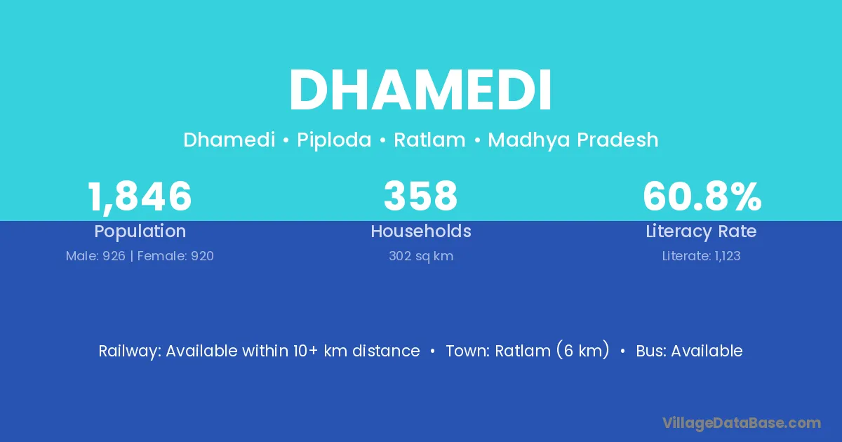 Ratlam (6 km) is the nearest town to Dhamedi village for major economic activities and is located approximately 6 km away.