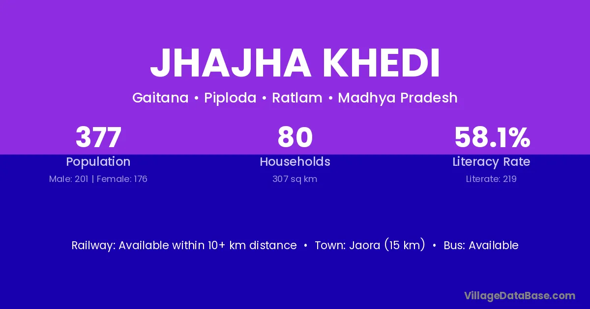 Jhajha Khedi village has a total population of 377 people, of which 201 are males and 176 are females.