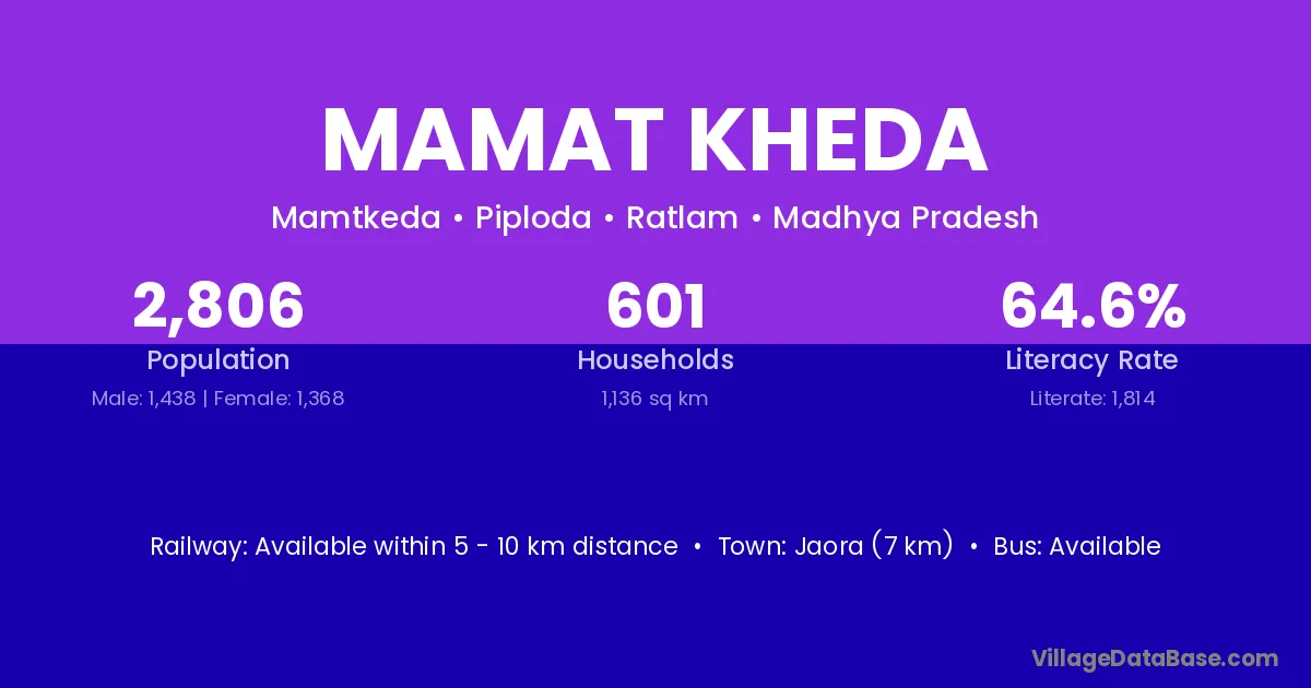 Jaora (7 km) is the nearest town to Mamat Kheda village for major economic activities and is located approximately 7 km away.