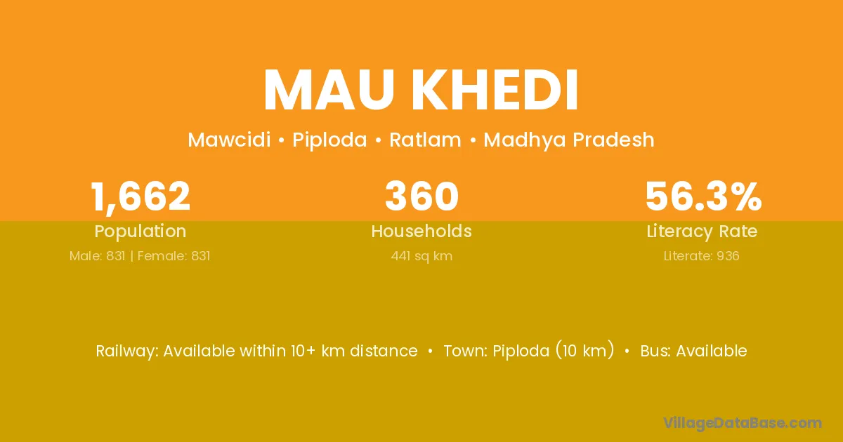 Piploda (10 km) is the nearest town to Mau Khedi village for major economic activities and is located approximately 10 km away.