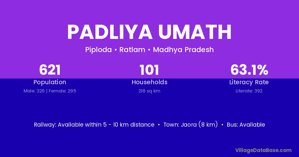 Jaora (8 km) is the nearest town to Padliya Umath village for major economic activities and is located approximately 8 km away.