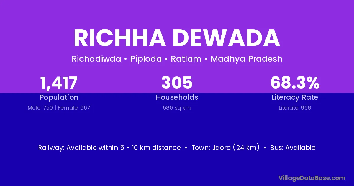 Jaora (24 km) is the nearest town to Richha Dewada village for major economic activities and is located approximately 24 km away.
