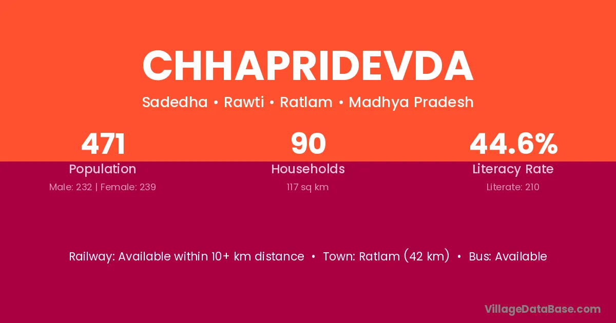Ratlam (42 km) is the nearest town to Chhapridevda village for major economic activities and is located approximately 42 km away.