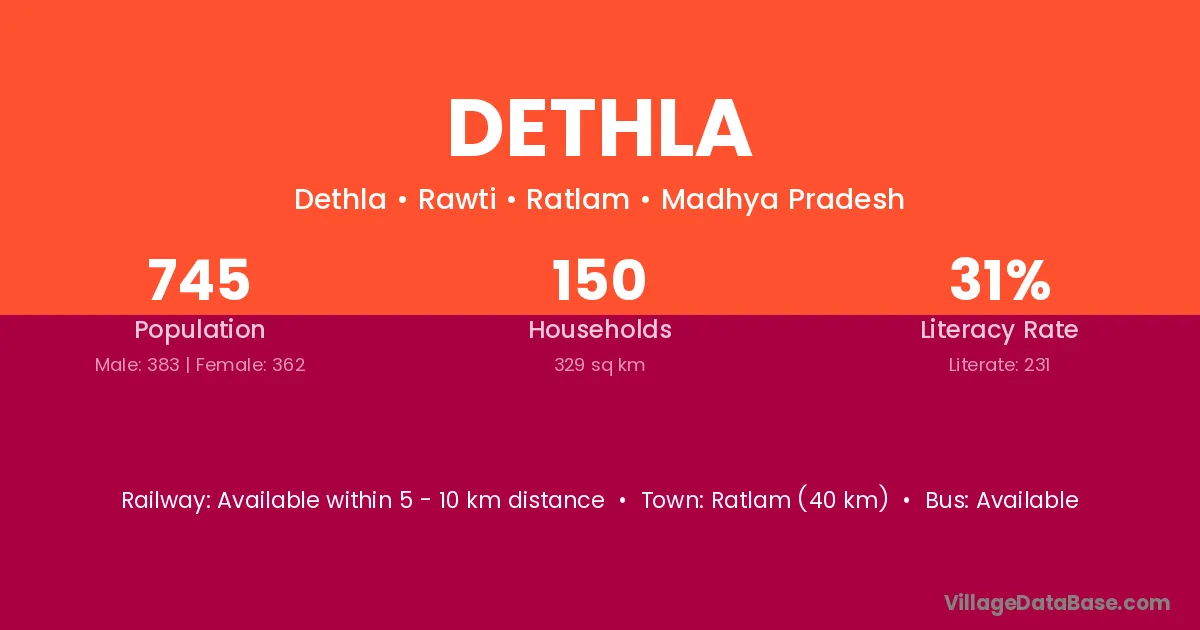 Ratlam (40 km) is the nearest town to Dethla village for major economic activities and is located approximately 40 km away.
