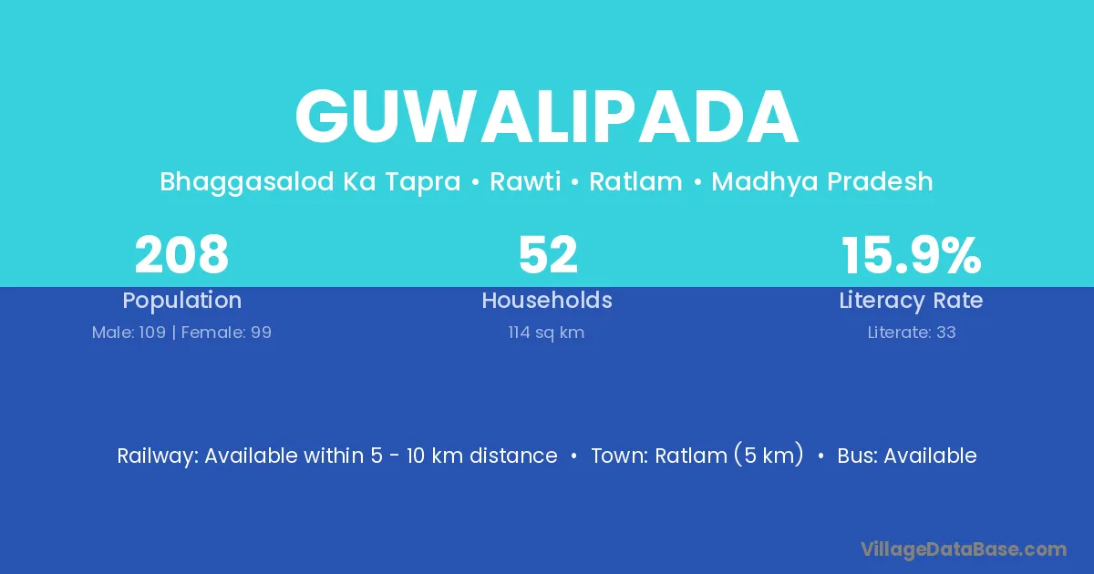 Ratlam (5 km) is the nearest town to Guwalipada village for major economic activities and is located approximately 5 km away.