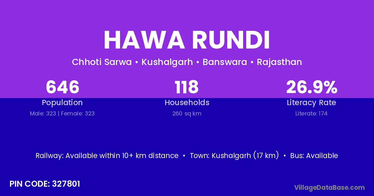 The literacy rate of Hawa Rundi village is 22.25%. Male literacy stands at 27.45% and female literacy at 16.29%.