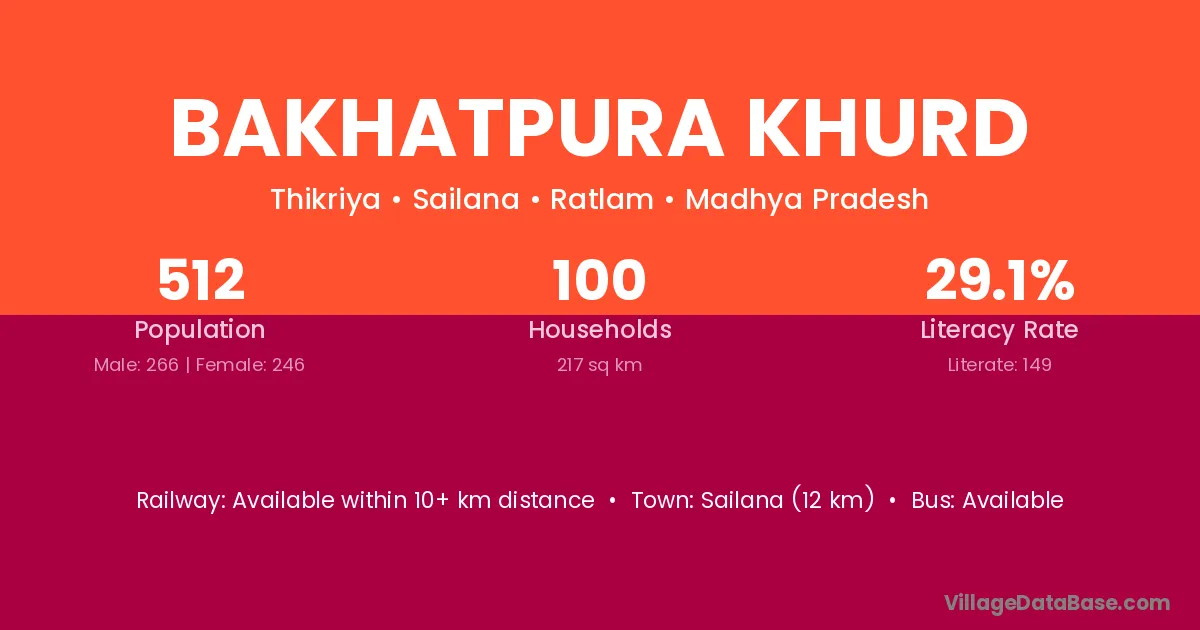 Sailana (12 km) is the nearest town to Bakhatpura Khurd village for major economic activities and is located approximately 12 km away.