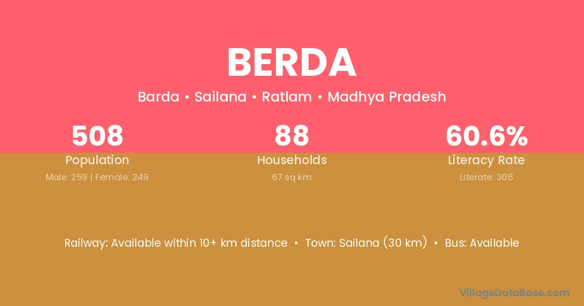 Sailana (30 km) is the nearest town to Berda village for major economic activities and is located approximately 30 km away.