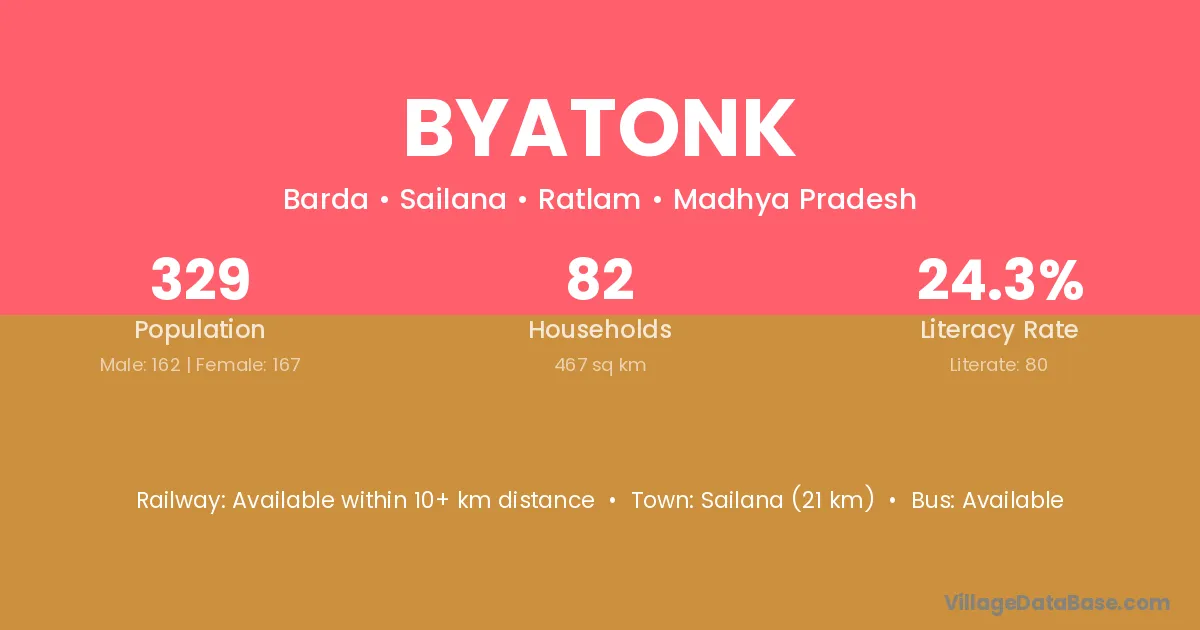Sailana (21 km) is the nearest town to Byatonk village for major economic activities and is located approximately 21 km away.