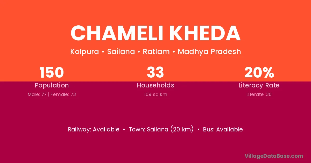 Chameli Kheda village has a total population of 150 people, of which 77 are males and 73 are females.